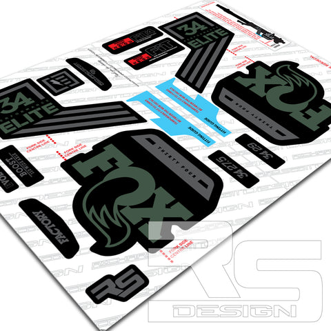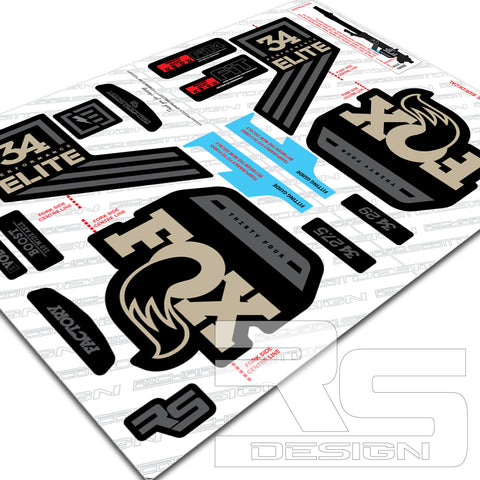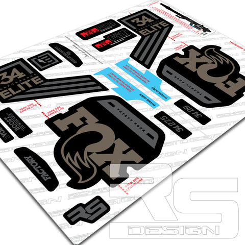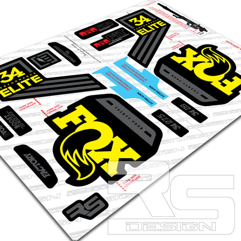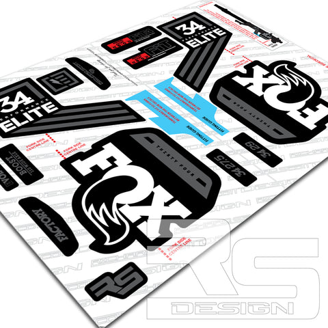 FOX 34 ELITE Decal kit. Printed onto High Tack sticker vinyl for maximum adhesion to painted products. Over laminated in Gloss or Matte laminate for durability as standard.