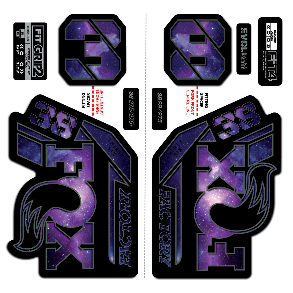 FOX 38 GALAXY Decal kit. Printed onto High Tack sticker vinyl for maximum adhesion to painted products. Over laminated in Gloss or Matte laminate for durability as standard.